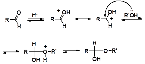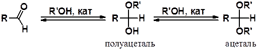 В присутствии катализатора спирты присоединяются к альдегидам с образованием полуацеталей и ацеталей («полных ацеталей»).
