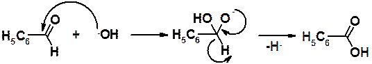 Гидроксид-анион, атакует углерод карбонильной группы с образованием годроксигидроксидного аниона. Последний теряет гидрид-ион (Н-) и превращается в карбоновую кислоту.