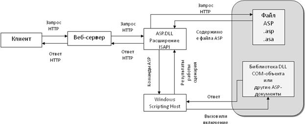 · ASP.DLL просматривает файлы с указанными расширениями на наличие тегов, обозначающих внедренный код для выполнения на сервер и передает найденный код в Windows Script Host (WSH).
