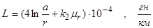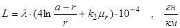 Для цепей воздушных линий расстояние а между проводами во много раз больше радиуса проводов r (например, а=20 см, а r =0,2 см), поэтому можно пренебречь величиной r по сравнению с а (в числителе выражения под знаком логарифма) и формулу индуктивности переписать так:
