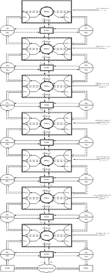 Трехуровневая модель выделяет зоны межуровневого преобразования информации. Снизу в верх движутся информационные потоки, правая структура начиная с образной информации определяющаяся внешней окружающей средой организма.