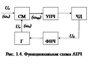 Рассмотрим систему АПЧ радиоприемного устройства, предназначенную для поддержания промежуточной частоты сигнала на заданном уровне (рис. 1.4). Входной сигнал - напряжение uc{t) частотой wпр— преобразуется в смесителе (СМ) в напряжение промежуточной частоты wпр, усиливается усилителем промежуточной частоты (УПЧ) и подается на частотный дискриминатор (ЧД). Если промежуточная частота сигнала отличается на Dw от ее номинального значения, равного центральной частоте УПЧ, то на выходе ЧД возникает напряжение, значение и знак которого зависят от значения и знака отклонения промежуточной частоты Dw. Напряжение с ЧД через фильтр нижних частот (ФНЧ) подается на гетеродин (Г) (перестраиваемый генератор), частота сигнала которого перестраивается таким образом, что отклонение Dw уменьшается, в результате чего промежуточная частота с заданной точностью оказывается равной центральной частоте УПЧ wпро.