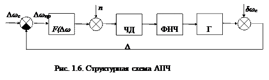 Коэффициент передачи является одной из основных характеристик системы АПЧ, его значение во многом определяет точность стабилизации промежуточной частоты, динамические характеристики системы. Из выражения (1.8) следует, что с увеличением коэффициента передачи ошибка (1.8) уменьшается. Зная допустимую ошибку и максимальное значение Dw по (1.8), можно найти необходимый коэффициент передачи системы АПЧ. По соотношениям (1.4) —(1.7) на рис. 1.6 построена структурная схема системы АПЧ относительно отклонений от их номинальных значений