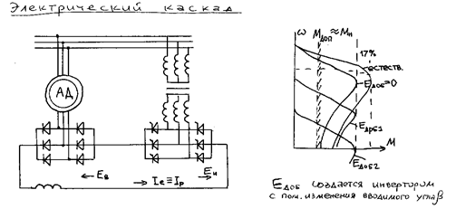 . Ток будет всегда отстающим а регулировать коэф. мощн. не представляется. возможным. Принцип регул скорости: Пусть противоЭДС =0 роторная цепь замкн. накоротко и двиг. раб на естественной хар-ке. При введении ЕДОБ стан ЕДОБ > Е2 т.к. ЕДОБ стала > Е2 выпрямит. мост запирается и I=0 в рот цепи, Е2РОТ=0 => МДВ=0 =>ωАД↓скольж S увелич => ЭДС рот цепи выпремлен UРОТ > добавочной противоЭДС в рот. цепи начинает протек ток и двигатель будет работать на новой механической характеристике с новым меньшим значением скорости.