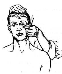 Поглаживание окологлазничной области проводится от внутреннего угла глаза к виску по ходу круговой мышцы глаза. Поглаживание спинки носа проводится II пальцем в направлении от кончика к переносью; обхватывающее поглаживание I и II пальцами.