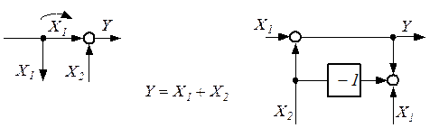 2. При переносе узла через сумматор по ходу сигнала следует добавить линию связи между боковыми ветвями, направленную по ходу сигнала и содержит звено с КУ = -1