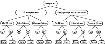 Пример. Поставлена задача — создать иерархическую систему классификации для информационного объекта Факультет, которая позволит классифицировать информацию обо всех студентах по следующим классификационным признакам: факультет, на котором он учится, возрастной состав студентов, пол студента, для женщин — наличие детей. Система классификации представлена на рис. 4.2. и будет иметь следующие уровни: