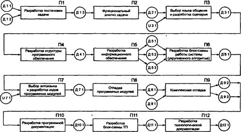 Далее следуют «Разработка программной документации» (П10) и получение всей совокупности документов (Д10.1), после которой разрабатывается блок-схема технологического процесса решения задачи в диалоговом режиме (П11) и получают документ - блок-схему ТП (Д11.1), содержащую перечень ручных, машинно-ручных и автоматических операций, выполняемых в определенной последовательности пользователем при решении задачи.