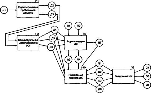 Рис. 12.9.Технологическая сеть проектирования информационного хранилища: Д1 - материалы предпроектного обследования, Д2 - техническое задание, ДЗ - технико-экономическое обоснование проекта; Д4 - логическая структура данных ИХ; Д5- схема преобразования данных, Д6 - логическая структура данных витрин, Д7 - схема размещения ИХ в сетевой вычислительной среде, Д8 - проектная документация, U1 - универсум программных средств, U2 - универсум технических средств, U3 - универсум программных средств реализации ИХ, U4 - универсум технических средств реализации ИХ, G1 - репозиторий, G2 - настройка или процедуры инструментальных средств, G3 – наполнение информационного хранилища для MOLAP-структуры, G4 - модифицированный репозиторий, GS - модифицированные настройки или процедуры инструментальных средств, G6 - модифицированное информационное хранилище для MOLAP-структуры
