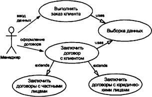 Несколько прецедентов использования может иметь общую часть, выделяемую в самостоятельный прецедент использования, с которым устанавливаются отношения использования (uses). С другой стороны, некоторые прецеденты использования могут быть расширены деталями. В таком случае создается дополнительный прецедент использования, с которым устанавливаются отношения расширения (extends). Пример применения такого рода отношений показан на рис. 13.10.
