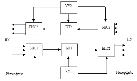 На рис. 1.9 введены следующие обозначения: ВУ – верхний уровень, НУ – нижний уровень, БВС – блок входящих сообщений, БИС – блок исходящих сообщений, БП – блок памяти для хранения протокольных единиц; УУ – устройства управления уровнем.