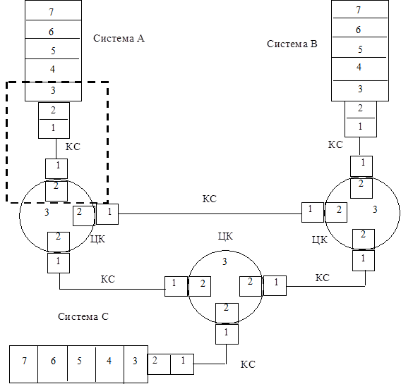 Из всего сказанного следует, что ИС рассматривается как совокупность систем, связанных между собой некоторой передающей средой. В качестве систем выступают ЭВМ и ЦК. Процессы, распределенные по разным системам, взаимодействуют через передающую среду путем обмена сообщениями. Обмен сообщениями между объектами разных систем осуществляется только через объекты нижележащего уровня. Следовательно, процедуры обмена сообщениями между различными открытыми системами включает протокольные процедуры соответствующих уровней и ряд межуровневых интерфейсных процедур.