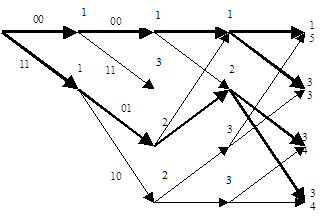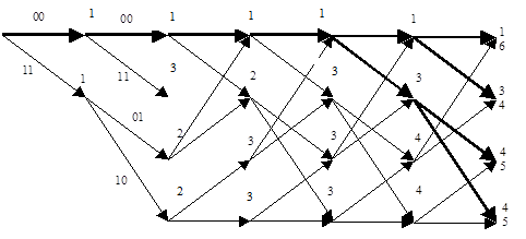 Продемонстрируем процесс кодирования с помощью решетчатого графа, например, кодируя входную комбинацию =101100 . . ., т.е. Выходная комбинация, найденная по графу (жирные линии) будет 1101001010, что можно проверить, воспользовавшись построенной ранее образующей матрицей и сложив по модулю два 1, 3 и 4 ее строки