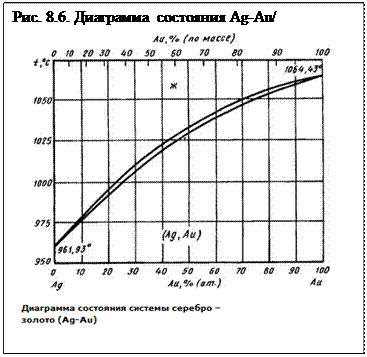 Ag и Аu образуют между собой непрерывный ряд твердых растворов. Построенные экспериментально кривые ликвидуса (на фазовых диаграммах линия полного плавления твёрдых фаз) и солидуса (линия на фазовых диаграммах, на которой исчезают последние капли расплава, или температура, при которой плавится самый легкоплавкий компонент) хорошо согласуются с расчетными кривыми, полученными термодинамическим путем. Интервал кристаллизации сплавов в средней части диаграммы состояния не превышает примерно 2 °С. Сплав, содержащий 50 % (ат.) Аu, имеет температуры ликвидуса и солидуса, равные, соответственно, 1032,5 и 1030,8 °С. Обнаружено отсутствие непрерывности на кривых зависимости электросопротивления, эффекта Холла и периода кристаллической решетки от состава для сплавов, отвечающих составам Ag3Au, Ag3Au2 и AgAu3.