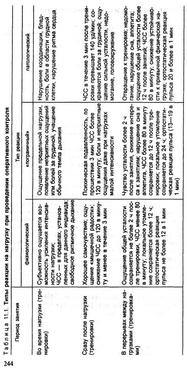 При проведении оперативного экспресс-контроля с учетом субъективных ощущений различают три типа реакции на тренировочную нагрузку: физиологический, «пограничный» и патологический (табл.11.1).