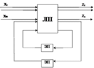 Часть устройства, в котором сосредоточены логические элементы (элементы без памяти), называют логическим преобразователем (ЛП). На входы элементов памяти, выступающих в роли элементов задержки, воздействуют сигналы, снимаемые с дополнительных (внутренних) выходов ЛП. Будем предполагать, что каждый элемент памяти будет находиться в двух состояниях: 0 и 1. Каждый элемент памяти может сохранить 2s состояний.