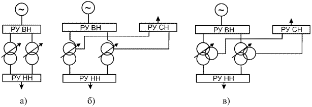 Типовые структурные схемы подстанций с тремя или двумя напряжениями приведены на рис. 2.7. На подстанции с двухобмоточными трансформаторами (рис. 2.7, а) электроэнергия от системы поступает в РУ ВН, затем трансформируется и распределяется между потребителями, присоединенными к РУ НН. При наличии потребителей электроэнергии, получающих питание от РУ двух напряжений НН (6 или 10 кВ) и среднего напряжения (СН) (35кВ), применяют схемы с трехобмоточными трансформаторами (рис. 2.7, в).