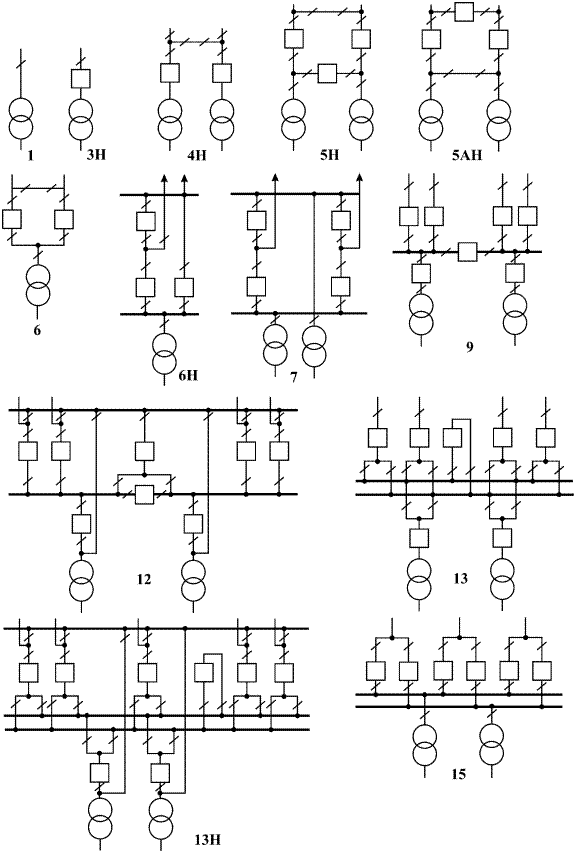 Схема 1 применяется в условиях загрязненной атмосферы, где целесообразна установка минимума коммутационной аппаратуры, или для ПС 330 кВ, питаемых по двум коротким ВЛ. Сдвоенная схема ЗН применяется вместо схемы 4Н в условиях стесненной площадки.