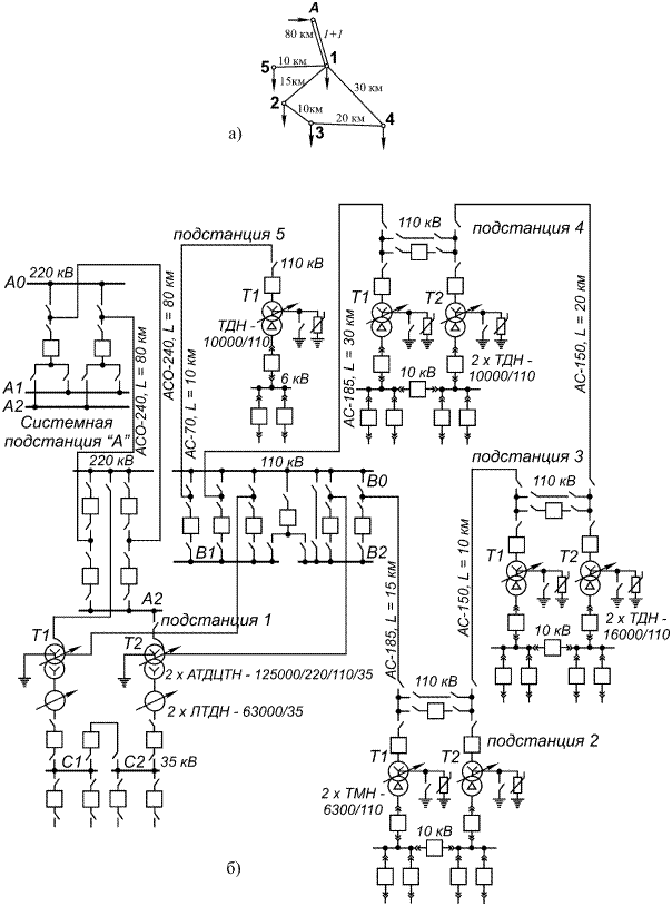 Схема электрической сети определяется применяемыми номинальными напряжениями, числом ступеней трансформации, надежностью электроснабжения потребителей электрической энергии, схемами электрических соединений подстанции (ПС).