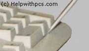 Shutdown your PC and remove the main plug, unplug the keyboard (remember where it was plugged in) and hold it upside down to release any debris from in-between the keys. This is where the patience comes in, make a note of the position of all the keys or you will have trouble putting them back correctly, alternatively just remove the letter keys A - Z from the keyboard (which is where the most of the dust/debris will be) and refer to fig. 2 as a reference to put them back. All the keys can be removed although the larger keys (space bar, enter key, shift keys, backspace, caps lock, etc) can be difficult to put back so you might avoid removing them. Remove the keys using the screwdriver, ease the screwdriver under the key and gently lift the key top off (see fig. 1). Note: don't forget to make a note of their position!!