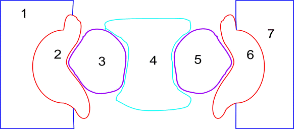 Общая схема вакуумная разряда представлена нар рис. 1.1. Путь проходимый током в области вакуумного разряда можно разделить на 7 частей. 1 – твердый материал катода. 2 –зона расплава под плотной плазмой. 3 – область плотной светящейся плазмы, 4 – межэлектродный столб, 5 – область плотной плазмы анодного пятна, 6 – зона расплава анодного пятна, 7 – твердый материал анода.