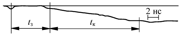 При приложении к вакуумному промежутку импульса напряжения с фронтом 10-9 с через некоторое время, называемое временем запаздывания, начинается рост тока искры. На рис. 3.1 показана типичная осциллограмма тока искры, полученная с помощью емкостного делителя напряжения, встроенного в передающую коаксиальную линию. Пик тока в левой части осциллограммы соответствует моменту прихода импульса напряжения на вакуумный промежуток и обусловлен током смещения через емкость разрядной камеры. Далее следует участок осциллограммы без тока (время запаздывания пробоя tз), за которым идет участок относительно монотонного роста тока до амплитудного значения, ограниченного сопротивлением разрядного контура (время коммутации tк). После этого времени начинается дуговая стадия. Обычно время tк отсчитывается между уровнями 0.1 и 0.9 от амплитудного значения тока, равного Ua/R, где Ua - амплитуда напряжения, R - сопротивление разрядного контура. Это время характеризует длительность искровой стадии вакуумного разряда ts. Однако время tк не равно в точности времени ts, так как при большом сопротивлении R может быть tк ts. Время запаздывания появления искры tз является фактически длительностью стадии пробоя. Это время измеряется от максимума пика емкостного тока до уровня 0.1 от амплитуды значения тока. О природе времени tз мы говорили в главе 2.