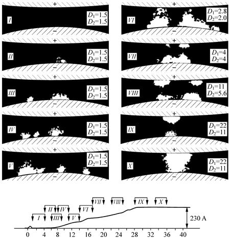 Средняя скорость расширения катодных и анодных факелов оценивалась по скорости движения границы плотного свечения. Было обнаружено, что начальная скорость расширения КФ приблизительно постоянна и равна 1.7×106 см/с. Скорость расширения КФ определялась из кадров IX и X, снятых при одинаковых диафрагмах объективов. Она оказалась равной 2×106 см/с.