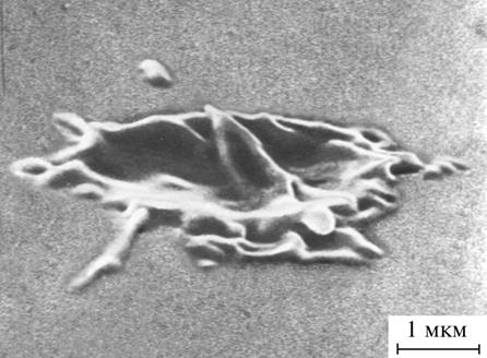 В зависимости от условий эксперимента меняются вид, плотность расположения и “качественный” состав микрократеров. Наиболее простой формой микрократеров являются “кратеры-зародыши”. Как правило, они возникают на дефектах поверхности катода. Микрократеры на гладкой поверхности удалось обнаружить начиная с длительности импульса tи = 5 нс и более. С ростом последней примерно до 100 нс размеры кратеров увеличиваются до 3-5 мкм. Дальнейшее возрастание длительности импульсов приводит в основном к появлению субструктуры кратеров (рис. 10.9). Субструктура кратеров проявляется в том, что новые микровзрывы возникают на краях имеющихся кратеров.