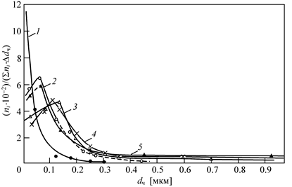 | Рис.3.6 Распределение капель по диаметру dч при tи = 10 (1); 35 (2); 50 (3); 100 (4) и 300 нс (5). |