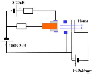 Типичная схема ионного источника представлена на рис 7.1. В данном случае для инициирования разряда используется вспомогательный разряд по поверхности диэлектрика. Схемы питания дуги и инициирующего разряда находятся под потенциалом , необходимым для вытягивания ионов дугового разряда из разрядного промежутка.