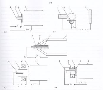 | Рис.7.2 Способы инициирования вакуумного разряда а- по поверхности диэлектрика б — вакуумно дуговой в- с использованием проводящего покрытия г -магнетронным Д — пеннинговским. 1-катод дуги, 2- анод дуги, 3- катод вспомогательного разряда, 4-анод вспомогательного Разряда 5- изолятор 6-плазма вспомогательного разряда 7- проводящее покрытие, 8-постоянный магнит, 9- контрагирующий электрод |
