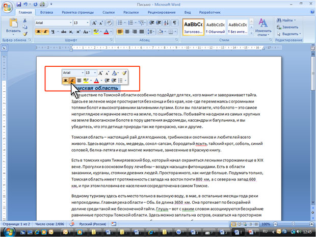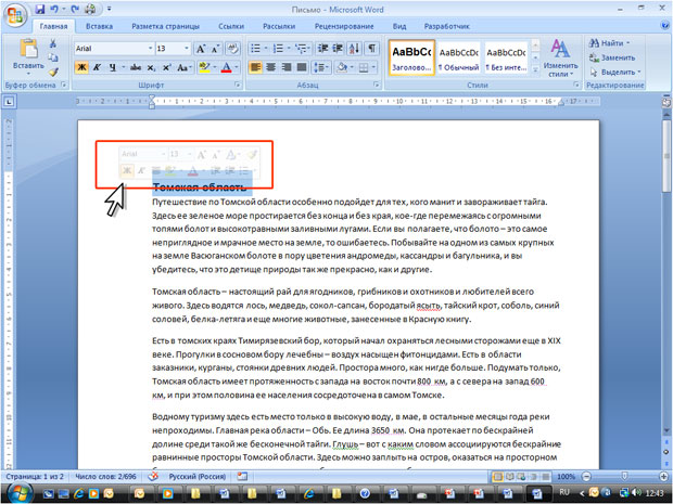 Мини-панель инструментов содержит основные наиболее часто используемые элементы для оформления текста документа.