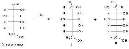 При присоединении синильной кислоты к альдегидной группе гексозы образуются два диастереомерные гидроксинитрилы, отличающиеся конфигурацией первого тетраэдра: