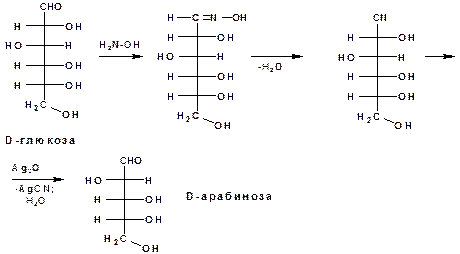 Реакцией с гидроксиламином переходят от более высших моноз - к низшим. Сахара легко образуют оксимы. Дегидратацией оксимов получают гидроксинитрилы, от которых отщепляют синильную кислоту влажной окисью серебра, при этом образуется гидроксиальдегид с числом углеродных атомов на один меньше, чем в исходном сахариде: