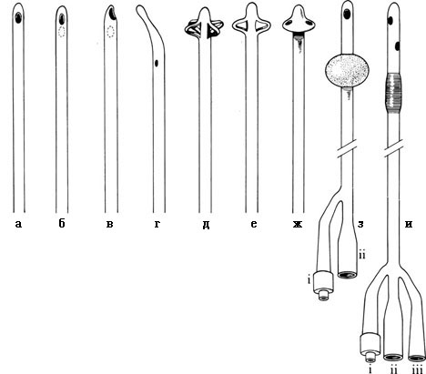 ж) Катетер Пеццера, самофиксирующийся, используется для эпицистостомии.
