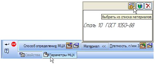 Для определения материала, из которого изготовлена деталь, откройте закладку Параметры МЦХ. На панели Наименование материала нажмите кнопку Выбрать из списка материалов. По умолчанию система предлагает Сталь 10. Если нужна другая марка, то следует выбрать из списка материалов, как показано на рисунке 37.
