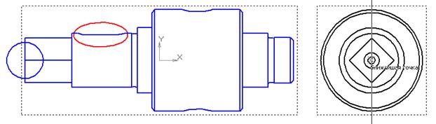 Курсором укажите сначала на эллипс, он подсветится красным цветом. После этого компьютер попросит указать, где проходит секущая плоскость для местного разреза. Плоскость проходит через центр вида слева. Таким же способом создайте местный разрез для центрового отверстия.