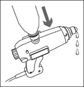 - Сдавливая пластиковую бутылку, произведите заправку до момента, когда из отверстия сопла начнет вытекать вода (см. рис.).