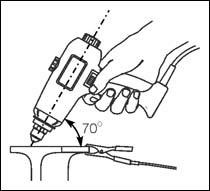 - При сварке держите горелку с наклоном около 70o к свариваемой поверхности (см. рис.).