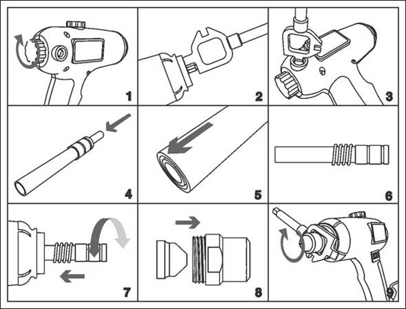 - Наденьте колпачок с соплом на выступающую часть испарителя, не допуская перекоса сопла. Затяните колпачок универсальным ключом.