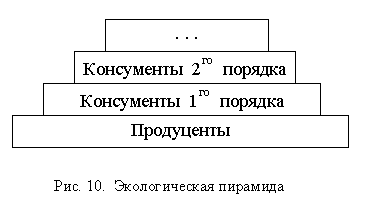 В результате последовательности превращений энергии в пищевых цепях каждое сообщество живых организмов в экосистеме приобретает определенную трофическую структуру. Трофическая структура сообщества отражает соотношение между продуцентами, консументами (отдельно первого, второго и т.д. порядков) и редуцентами, выраженное или количеством особей живых организмов, или их биомассой, или заключенной в них энергией, рассчитанных на единицу площади в единицу времени. Графически трофическую структуру сообщества представляют в виде пирамиды. Основанием пирамиды служит первый трофический уровень - уровень продуцентов, а последующие уровни образуют следующие этажи пирамиды. При этом высота всех блоков-этажей - одинакова, а длина пропорциональна числу, биомассе или энергии на соответствующем уровне (рис. 10).