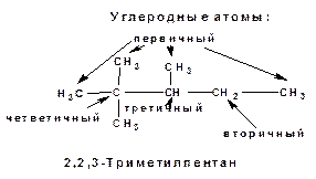 Атом углерода в молекуле алкана, соединенный с не более чем одним соседним атомом углерода – называется первичным. Атом углерода в молекуле алкана, соединенный с не более чем двумя соседними атомомами углерода – называется вторичным. Атом углерода в молекуле алкана, соединенный с не более чем тремя соседними атомами углерода – называется третичным. Атом углерода в молекуле алкана, соединенный с четырьмя соседними атомами углерода – называется четвертичным.