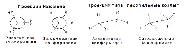 Две конформации этана, показанные выше, больше других различаются по энергии между собой. Эти конформации получили название «заслоненная» и «заторможенная».