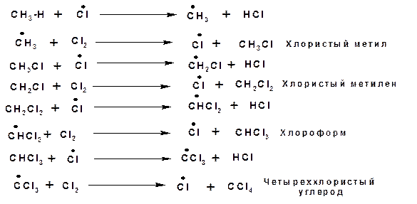 Исследования реакции хлорирования метана или реакции металепсии показали, что эта реакция имеет цепной, радикальный механизм и включает основные три стадии.