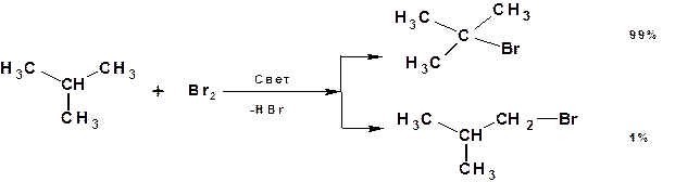 Реакция бромирования значительно менее экзотермична, чем хлорирование. Причем образование бромистого водорода при росте цепи является эндотермической реакцией. Поэтому скорость роста цепи гораздо ниже, чем при хлорировании. Более медленное течение реакции бромирования способствует более высокой избирательности (селективности) по сравнению с хлорированием. Соответственно в продуктах фотохимического бромирования алканов значительно преобладают продукты, образующиеся при разрыве наименее прочной связи С-Н и протекании реакции через наиболее стабильный радикал: