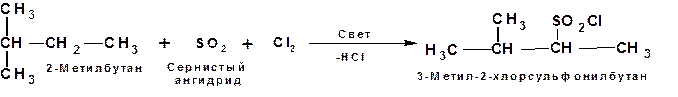 Сульфохлорирование алканов при УФ-облучении, при комнатной температуре, протекает как цепной радикальный процесс (реакция Руффа). В качестве продуктов образуются хлорангидриды алкансульфокислот. Особенностью реакции является следующее: при наличии в молекуле углеводорода первичных, вторичных и третичных атомов углерода замещению не подвергаются атомы водорода при третичном атоме углерода: