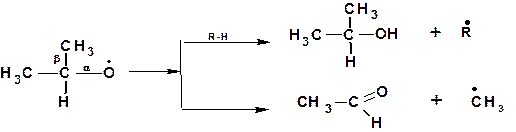 2. Распадаются по β-связи (β по отношению к атому, несущему радикал) с образованием альдегидов и кетонов.