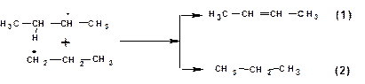 Окислительно-восстановительный процесс с участием двух радикалов. В ходе процесса расщепляются β-связи между α-углеродным атомом и соединенным с ним атомом водорода. При диспропорционировании образуются алкан и алкен с числом углеродных атомов равным числу углеродных атомов в исходных радикалах. Например: