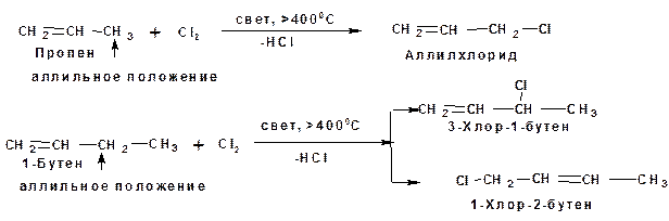 Взаимодействие гомологов этилена с галогенами (хлор, бром) при высоких температурах, свыше 4000С, ведет только к замещению атома водорода в аллильном положении на галоген и называется аллильным замещением. Двойная связь при этом в конечном продукте сохраняется: