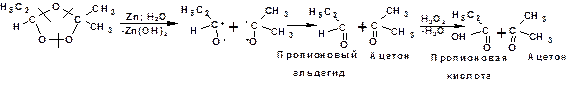 2. Разложение озонида, которое проводят под действием либо восстановителя (цинковая пыль в водной уксусной кислоте), либо окислителя, в качестве которого используют пероксид водорода. Под действием восстановителя процесс разложения идет до карбонильных соединений. В присутствии окислителя альдегиды окисляются до карбоновых кислот: